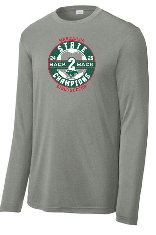 Marcellus Soccer State Champion Sport Tek Competitor Unisex Long Sleeve Back to Back Logo